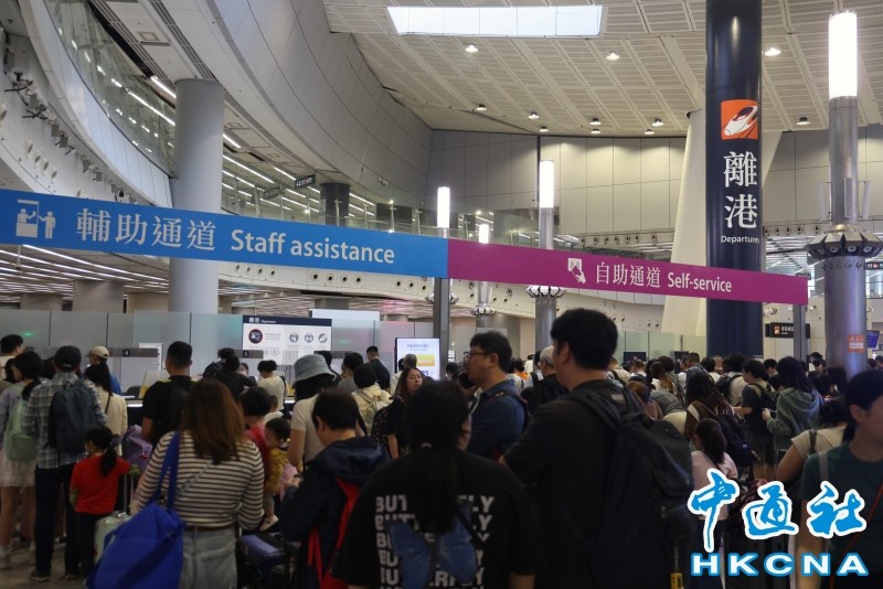 當天下午的西九龍高鐵站,大堂擠滿等候入閘的乘客,拖著大大小小的行李箱。“今天大部分開往內地的列車車票均已售出,尚未購票的旅客可經羅湖、落馬洲口岸前往內地。”車站現場以粵語、普通話及英語三語反覆廣播,並提醒旅客預留充足時間入閘。