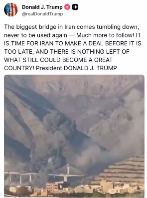 襲擊發生後,美國總統特朗普在社交媒體發布視頻,稱空襲炸毀伊朗“最大橋樑”,是為了施壓伊朗與美國“達成協議”。稍晚,他再次威脅稱,美國軍隊“還沒有開始摧毀伊朗剩下的東西”,接下來將打擊伊朗的橋樑和發電廠。