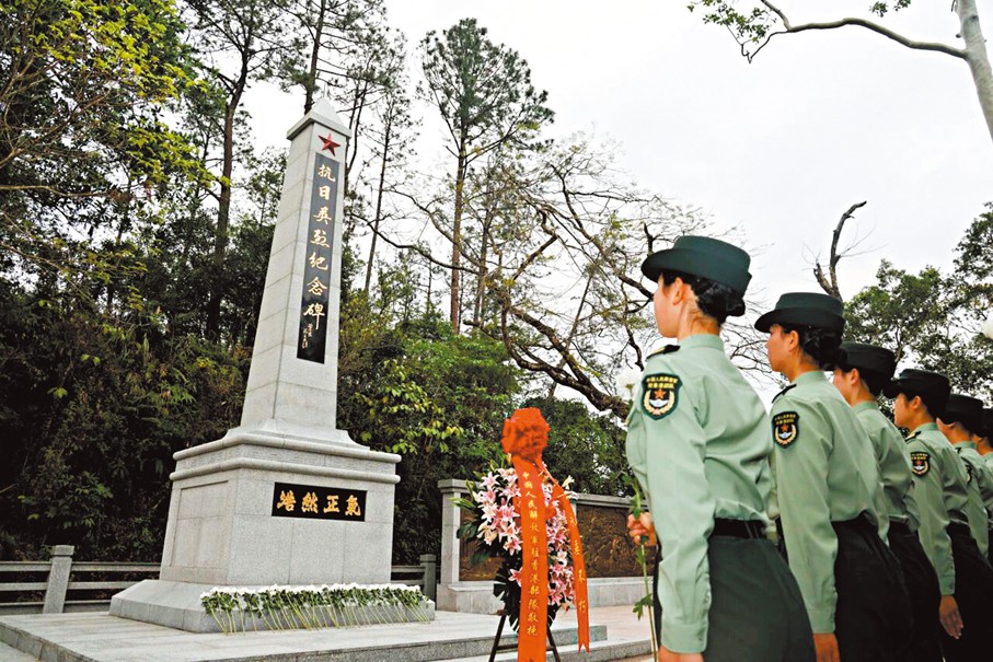 駐香港部隊官兵代表赴香港抗日英烈紀念碑開展瞻仰祭掃活動。 中國人民解放軍駐香港部隊官方微信公眾號“香江礪劍”圖片 烈士紀念園裡,抗日英烈紀念碑巍然矗立,參加活動的駐香港部隊官兵代表軍容嚴整、莊嚴肅穆。 大家仔細清掃紀念園區、擦拭紀念碑,向革命先烈敬獻花籃、默哀致敬,瞻仰烏蛟騰抗日英烈紀念碑、斬竹灣抗日英烈紀念碑和劉春祥抗日英雄群體紀念碑,感悟先烈們的愛國情懷與民族氣節,汲取投身強國強軍事業的奮進動力。