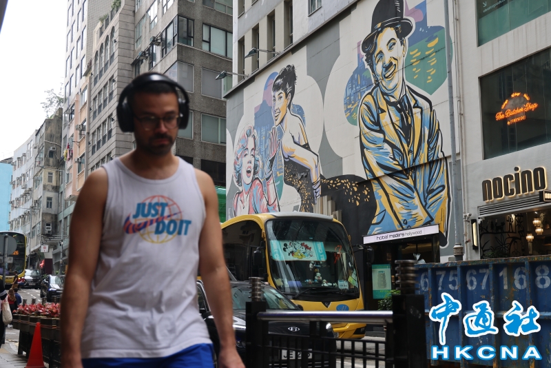 •   4月11日,途人經過中環一家精品酒店,外牆上畫上了荷里活明星,成為了中環的地標。香港中環荷里活道一帶的街頭壁畫區色彩繽紛,藝術氛圍與遊客熱情交織,形成假日獨特的城市風景線。(香港中通社記者 鄧梓傑 攝) 香港中通社圖片