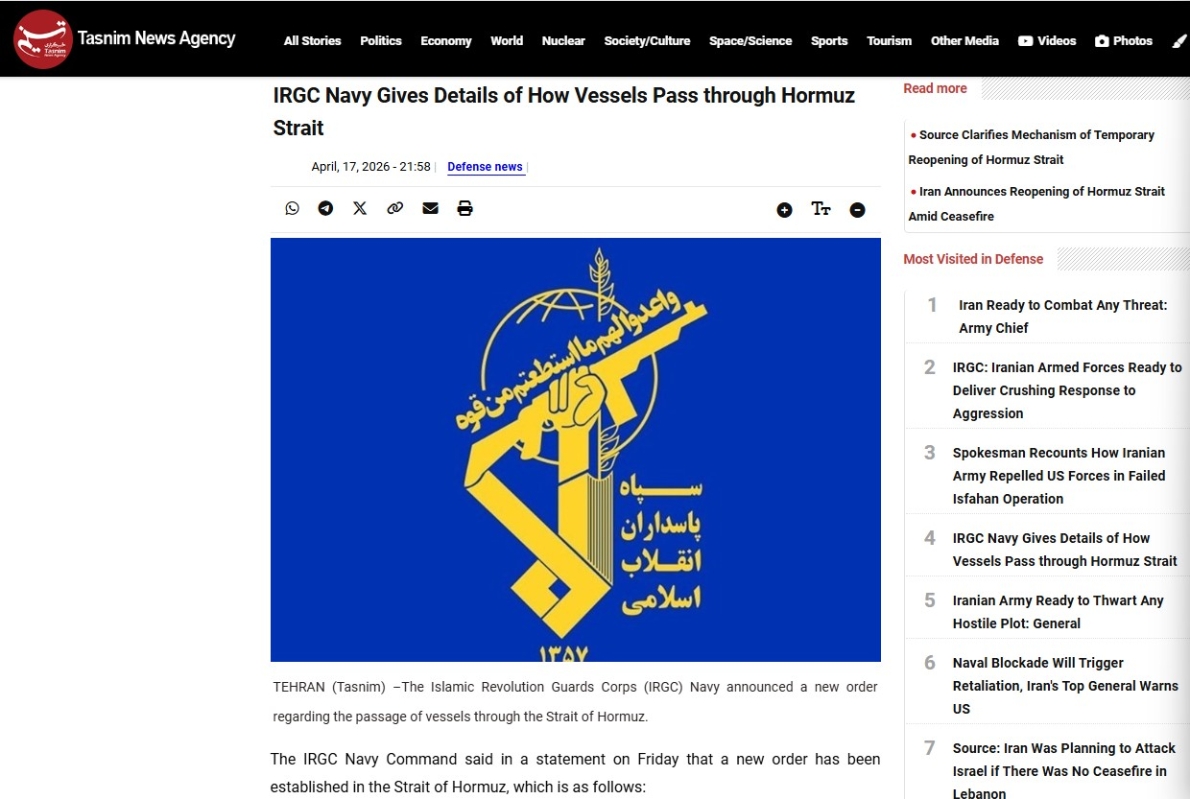 香港新聞網4月18日電 伊朗當地時間17日晚(北京時間18日凌晨),德黑蘭(塔斯尼姆)——伊斯蘭革命衛隊海軍宣布了一項關於船隻通過霍爾木茲海峽的新命令,對船隻通過霍爾木茲海峽設定了三個條件。 伊朗伊斯蘭革命衛隊海軍司令部當地時間17日晚在社交媒體發佈船舶在霍爾木茲海峽通行的新規定。伊朗國防部發言人後續強調,霍爾木茲海峽是有條件開放、暫時開放。