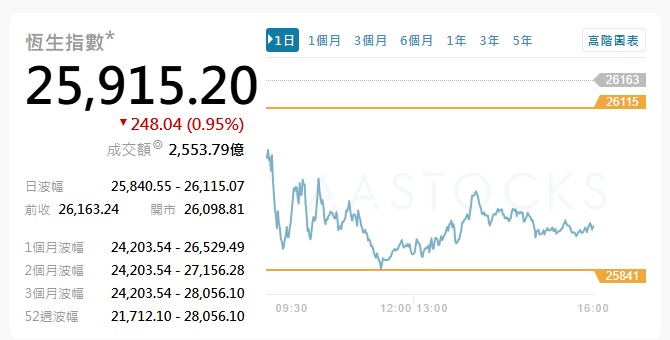 香港恒生指數跌248.04點 報25915.2點收盤分享到: