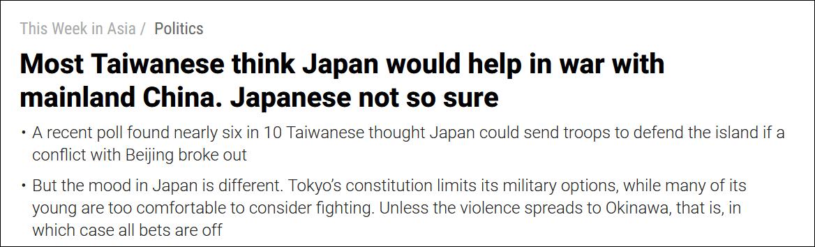 早前一份台灣綠營民調顯示,近六成的受訪者認為一旦大陸“武力犯台”,日本可能出兵協防台灣。但對於這份沉甸甸的“期許”,有日本學者和網民趕忙澄清——這簡直是白日夢,他們怕是有什麽誤會...... 這份2日由綠營民意調查機構“台灣民意基金會”公布的調查,引起了港媒的註意。調查中,65%的受訪者認為“美國可能出兵協防台灣”,還有58%的人認為“日本可能出兵協防”。然而在采訪了日本大學教授和學生後,港媒在5日的報道中直言,“對於日本的學者和分析人士來說,這項民調結果並不能準確地代表日本人的想法。”日本出兵面臨著和平憲法的限制,更重要的是,日本人的確對台灣抱有“同情”的態度,但也僅此而已,大多數日本人並不願意為了台灣而戰。