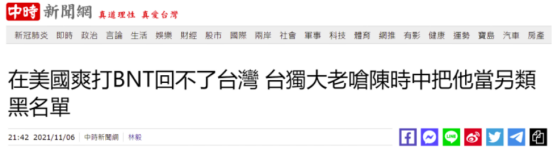 台灣“中時新聞網”報道截圖 報道稱,蔡丁貴是出了名的“台獨”,今年6月曾發文,喊話台灣年輕人應該勇敢去打“高端疫苗”,卻自爆自己已經在美國接種完2劑BNT,被痛批“別人家孩子死不完”,“‘台獨’是工作,住美國是生活”。 台灣網紅“宅神”朱學恒7日在臉書分享相關新聞報道,並發文開酸:“這就是危急時不惜讓你一戰的台派嘴臉。叫人打‘高端’,自己打BNT;叫人戰至最後一兵一卒,自己躲到美國去”。