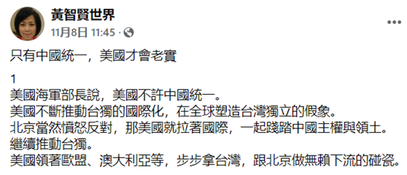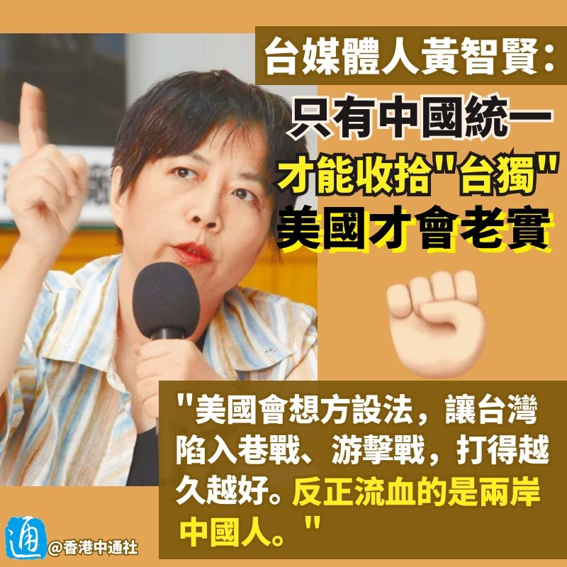香港新聞網11月10日電 美國近期頻打“台灣牌”,多次插手台海,美國海軍部長還給自己加戲,聲稱“大陸意圖接管台灣,會威脅美國經濟安全”,意圖阻止中國統一。對此,台灣媒體人黃智賢近日一針見血地指出,“只有中國統一,美國才會老實!” 11月8日,黃智賢在社交平台發文,揭露美國頻頻打“台灣牌”,是為了把台灣拖入戰爭深淵,在國際上製造更大的反華聲浪。