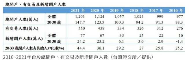 香港中通社1月4日電 台北消息:台媒4日報道,台灣證券交易所公佈最新統計,2021年12月底台股開戶數突破1200萬人大關,創歷史新高。2021年3月至年底10個月,新開戶數增加逾55萬人,其中20至40歲的年輕人,佔比超過72%。