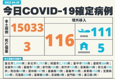 ● 台灣連續4天單日新增本土確診病例破千 台灣流行疫情指揮中心18日通報,新增1390例新冠肺炎本土病例,包含715例無症狀感染者,連續4天新增本土確診病例數破千。18日當天另新增90例境外移入病例。 ● 台灣放寬無症狀與輕症確診者解除隔離條件 台灣流行疫情指揮中心18日宣布,放寬新冠肺炎無症狀或輕症確診者解除隔離條件,只要滿足以下三點任一條,即可解除隔離,進行7天自主健康管理。包括:距發病日/采檢日4天內,追蹤2次快篩或核酸檢測陰性,或Ct值(判斷樣本中是否含有新冠病毒的重要依據之一)小於30;距發病日/采檢日5至9天內,追蹤1次快篩或PCR陰性,或Ct值小於30;距發病日/采檢日達10天,則無須接受采檢,就可解除隔離治療。 ● 台灣雞蛋價格再創新高