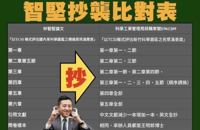 台灣大學學術倫理審定會日前公告,認定林智堅論文抄襲余姓碩士生論文,包括如摘要、第一章、第三章、第四章、結論都有大幅度抄襲情況。林智堅與余姓碩士生均為台大“國發所”學生,兩人論文均由陳明通擔任指導教授。 【編輯:周文菁】