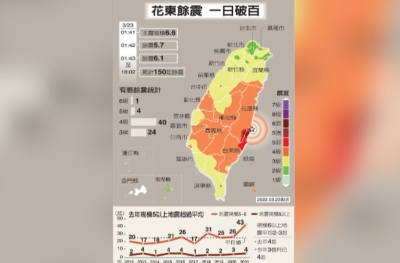 香港中通社10月11日電 台北消息:台灣花蓮外海11日清晨發生規模5.9地震。當局氣象部門地震測報中心表示,該地區規模5.5以上的地震發生頻率高於往年,但此次地震餘震發生不超過2天。