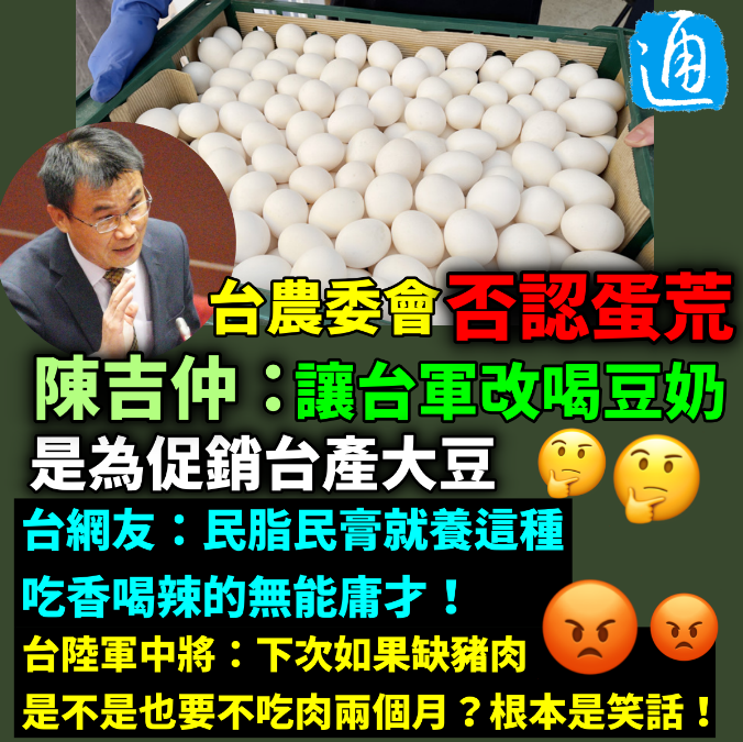 圖片製作:汪彥希 陳吉仲稱,提供台軍豆奶是為促銷台產大豆,他還強調,台軍目前雞蛋供應如常,豆奶是“另外贈送”。他聲稱,除了原先3月底進口500萬顆蛋外,也開放美、澳、日、土耳其等8個國家的殼蛋、液蛋及水煮蛋都會陸續進來。 台防務部部長邱國正亦在受訪時稱,“農委會”對軍隊很照顧和幫忙,額外提供216萬瓶豆奶作補充。他強調,雖然缺蛋,但軍中沒有說不准吃蛋,只是像外間一樣,本來每人一個荷包蛋,現在可能改為炒蛋。陳吉仲同日也表示,為軍隊提供豆奶是為了促銷台產的大豆,至於為軍隊提供的每天14萬隻雞蛋,“會如常地供應”。 中國國民黨“立委”費鴻泰直指,台灣已缺蛋至少兩年,台“農委會”主委陳吉仲已經變成全世界的笑話,“真是個X蛋”,趕快下台也許可以減緩缺蛋問題。 台陸軍中將吳斯懷指出,全世界的地區、國家,都不會因為國家、地區經濟、民生供需上出問題而叫軍隊停止食用或使用,連雞蛋都不讓台軍吃,下次如果缺豬肉,是不是也要不吃肉兩個月?根本是笑話。 此外,對於台防務部、台“農委會”的說辭,廣大民眾紛紛為自己為台軍鳴不平,不少民眾在相關網頁下留言怒嗆台當局“民脂民膏就養這種吃香喝辣混水摸魚混吃等死的無能庸才!”“台當局是在把台軍當垃圾桶嗎?”亦有人對陳吉仲的“促銷大豆”的迷惑發言表示不滿,稱“陳吉仲每天都在表演如何搞爛台灣人的生活!!” 此前,因全台“一蛋難求”不少民眾跑遍各處,都買不到蛋,宜蘭有捐血送蛋活動,限量一百盒,活動開始一大早,有人不到七點就來排隊,不少人無奈戲稱“在台灣,想要吃到蛋,得用血來換......” 【編輯:汪彥希】