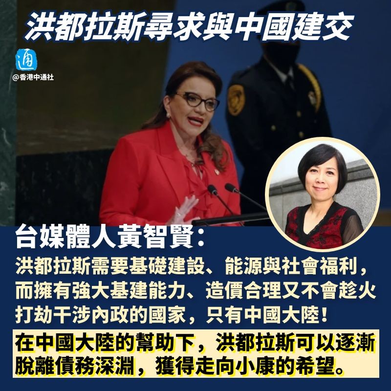 社交媒體截圖 黃智賢直言,洪都拉斯需要基礎建設、能源與社會福利,而擁有強大基建能力、造價合理又不會趁火打劫干涉內政的國家,只有中國大陸!她感歎,中國大陸提供給全世界的“中國模式”,不是歐美帝國主義的霸道掠奪,而是中國王道的合作共贏。 黃智賢還指出,中南美洲的痛苦宿命在於過去是帝國主義的殖民地,後來又長期被歐美和跨國財團剝削控制,多年以來找不到國家小康之路,只落得個民困財困的下場。“現在,洪都拉斯希望跟中國大陸建交以後,得到的不只是錢,而是走向小康的希望。”