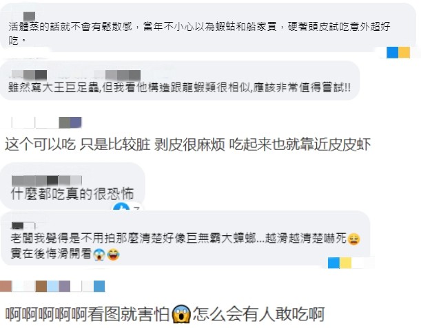 圖源:台灣“ETtoday新聞雲” 店家表示,“白肉的部分吃起來有龍蝦加螃蟹的食感與香氣,黃色的腺體吃起來有類似蟹黃蟹膏的口感與味道。”雖然“大王具足蟲拉麵”每碗要價1480新台幣,但店家透露目前預約已客滿,可見還是吸引到不少獵奇心重的美食探險家。 台灣自然科學博物館也藉助這股討論熱潮,在臉書科普“巨深水虱”(即大王具足蟲),指出大王具足蟲是深海環境中重要的食腐動物,並提到其消化道味道很重。台灣科博館生物學組副研究員李坤瑄接受台媒聯訪時提到,許多低拖漁船有時也會撈捕到大王具足蟲,有些人會請漁船帶回,收藏做標本用,後來有廚師發現,可以製作奇特料理,一般在潮間帶的海蟑螂、鼠婦,都是牠的親戚。 台南大學生物科技學系副教授黃銘志接受台灣“ETtoday新聞雲”的採訪時提到,台灣現在可以捕捉到的是詹姆斯具足蟲,而大王具足蟲棲息於墨西哥灣,之所以有這樣的誤會,推測可能是從日本翻譯過來的,雖然日本也沒有大王具足蟲。而台灣知名自然老師黃邦接受台灣“三立新聞網”採訪時表示,“大王具足蟲的近親其實就是大家熟知的海蟑螂,食用牠的習慣源自於日本,味道類似蝦子、螃蟹,而日本人不僅食用牠,還覺得牠很可愛!” 面對“具足蟲美食挑戰”,兩岸網友紛紛發表言論,有網友表示“應該非常值得嘗試”,“硬著頭皮試吃意外超好吃”,“吃起來也就靠近皮皮蝦”,但更多的兩岸網友紛紛表示不敢嘗試,“什麼都吃真的很恐怖”,“好像巨無霸大蟑螂”,“看圖就害怕,怎麼會有人敢吃啊”。