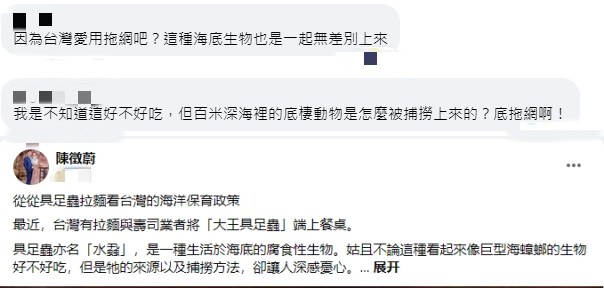 具足蟲拉麵的走紅,還讓一些網友發出“注重海洋生態”的呼籲,有人表示“因為台灣愛用拖網吧?這種海底生物也是一起無差別上來”,台灣健行科技大學應用外語學系副教授陳徵蔚在臉書發表評論,聲討“底拖網”對海洋生態的破壞以及台當局的不作為,呼籲就海洋保育製定相關法律規定。