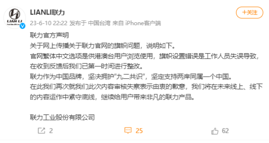 聯力在“繁體中文”選項旁放上“青天白日滿地紅”引發爭議 圖源:台媒 據環球網引述台媒報道,根據公告所述,聯力稱繁體中文是提供給港澳台的用戶使用,旗幟的設置錯誤是工作人員的失誤所導致,收到反饋後便在第一時間進行修改。聯力還稱,作為中國品牌,堅決擁護“九二共識”,堅定支持兩岸同屬一個中國,對此次內容審核失察表示由衷的歉意。