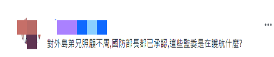 還有人表示,“對外島弟兄照顧不周,防務部門負責人都已承認,這些‘監委‘是在護航什麼?”↓