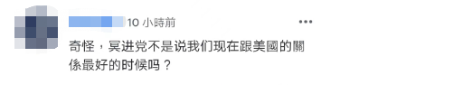 還有網友諷刺,“民進黨不是說我們現在跟美國的關係是最好的時候嗎?”↓