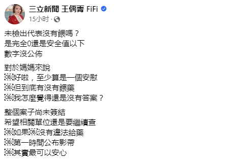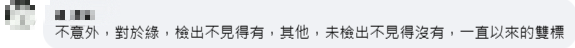王偊菁臉書截圖 有網友認為她的言論很“雙標”,對於綠營來說,就算“檢出也不見得有”;而其他的陣營,就算“沒檢出也不見得沒有”。
