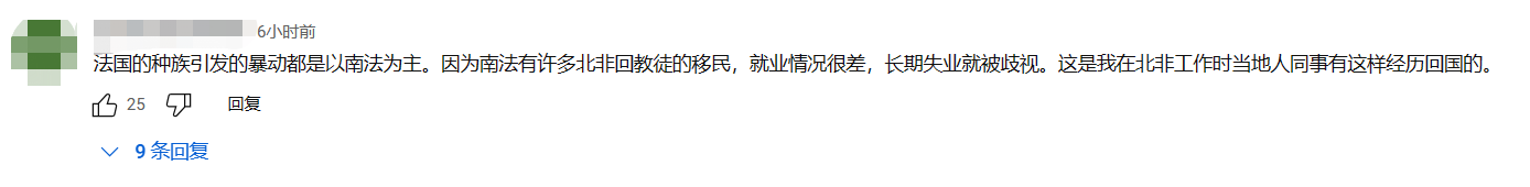 介文汲談法國騷亂。視頻截圖 “不僅僅是法國,整個歐洲都有這個問題。”介文汲指出,“他們的社會看起來有包容性和容忍性,其實是一個虛偽的假象。”事實上,歐洲社會對於移民者的下一代普遍缺乏包容,令這些“第二代移民”很難融入當地社會,於是滋生出非常強烈的反社會傾向,“平常到處實行‘小破壞’,這次有了機會就來個‘大破壞’”。 法國近幾年發生了好幾件大事,事件背後都隱藏著深層社會衝突。介文汲還提到,2011年,法國政府還推出了“面罩與罩袍禁令”,禁止少數穆斯林女性在公共場所穿戴面罩;2015年,曾多次因刊登政治和宗教人物漫畫引發爭議的《沙爾利周刊》雜誌社遭恐怖襲擊,造成多人傷亡;2020年,法國歷史教師帕蒂被疑似伊斯蘭極端分子當街砍殺斬首。 “這些問題都是累積出來的,”介文汲認為,歐洲社會“表面上講人權、包容,結果經不起考驗……法國只是一個縮影。” 在該視頻的評論區,有網友就分享了自己的觀察,指此次騷亂的主要地區南法有很多北非移民,他們“就業情況很差。長期失業就被歧視”,很多人難以融入當地社會。