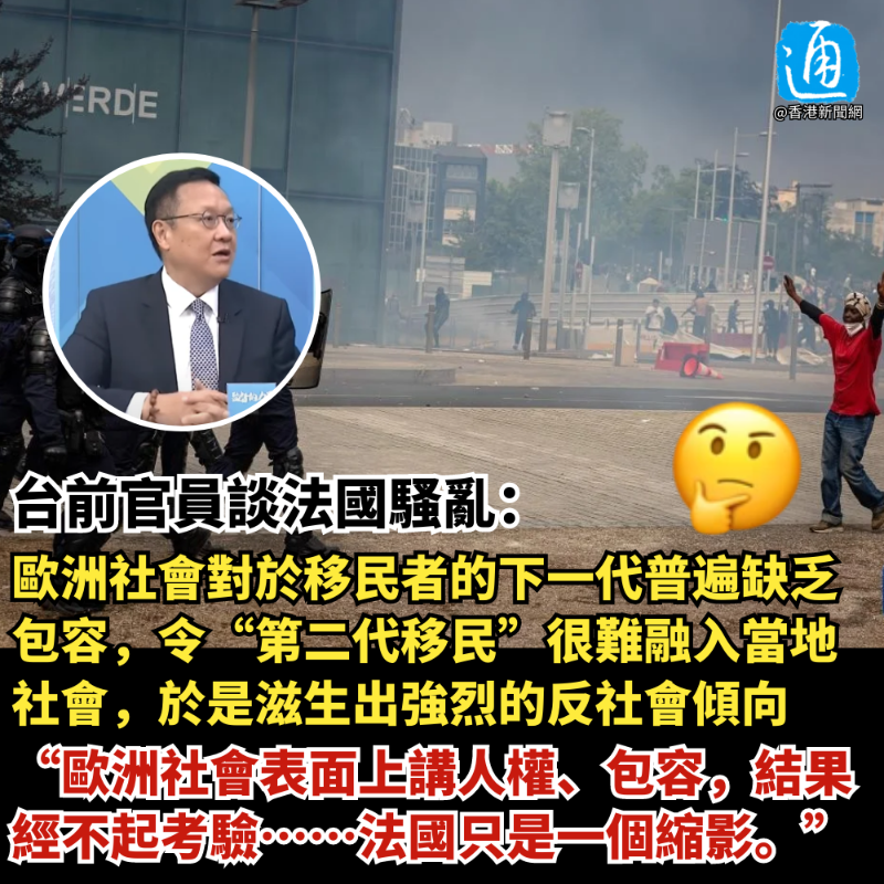 香港新聞網7月3日電 “警察射殺17歲非裔少年內爾(Nahel)”引發的憤怒和騷亂仍在法國蔓延,並引發國際社會關注。對此,台灣前外事官員介文汲日前在一檔政論節目中直指,法國騷亂其實撕開了西方社會所謂“包容”的假象。