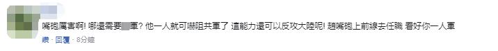 還有網友諷刺趙天麟“嘴炮”,“哪還需要台軍?他一人就可嚇阻解放軍了,這能力還可以反攻大陸呢!趙嘴炮上前線去任職,看好你一人軍。” ↓