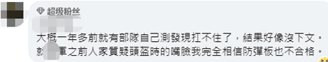 也有人稱,“大概一年多前就有部隊自己測發現扛不住了,結果好像沒下文。台軍之前人家質疑頭盔時的嘴臉,我完全相信防彈板也不合格。” ↓