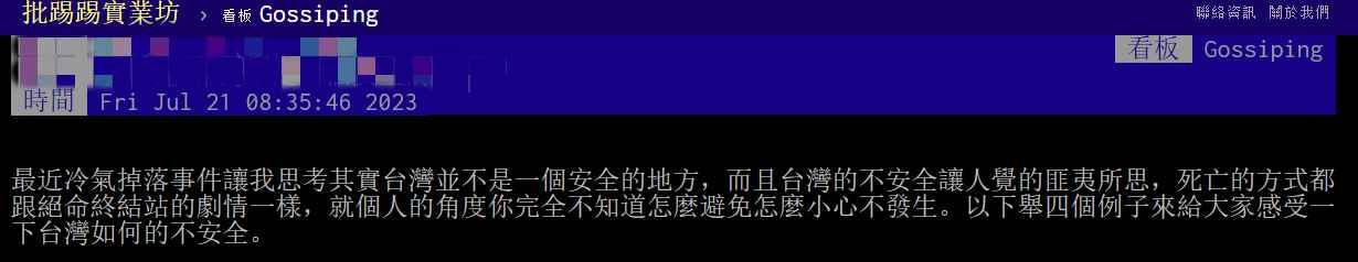 台灣PTT論壇截圖 該網友表示,最近的空調外機掉落事件讓他開始思考,其實台灣並不是一個安全的地方,而且讓人匪夷所思的是,事故當事人死亡的方式就跟拍驚悚電影一樣,在台灣妳完全不知道意外什麽時候會發生,妳也不知道該如何去避免。 該網友還例舉了近期台灣發生的各種意外事件,如正常在公路上駕駛的摩托車撞上叉車、正常過斑馬線的行人突遭出租車撞擊…… 之後該網友怒斥道:這些意外事件都是人禍,並且都是絕對可以避免的,主要問題是政府沒有營造一個良好的環境,對違法行為處罰的太輕,這就導致守法的人吃虧,而不守法分子愈加橫行霸道。 據悉,此次的空調外機墜樓事故在台灣並非個例,網絡上關於大樓施工意外的新聞屢見不鮮,並且台灣素來就有“行人地獄”的惡名,查詢台灣“道安資訊查詢網”可知,光是今年前四個月就發生了13萬余起交通事故,平均每月有上千人因此去世。 所以,也難怪有越來越多的台灣民眾在社交媒體上表達對自身安全的擔憂,正如一位網友說的“行人走路要擔心會不會被車撞,還要擔心頭上會不會掉東西,每天回到家都要慶幸自己多活了一天。” 此外,為了避免類似事件再發生,台灣各縣市開始出台相關舉措。 高雄市“議員”湯詠瑜今天(21日)呼籲督促各個大樓的管委會重新檢查有關外墻的施工規範,還建議高雄市政府加開“空調安裝職業安全訓練”的課程; 桃園市政府今天也表示,相關部門已經著手研究強化空調安裝墜落的風險管理。 【編輯:凌玉辉】