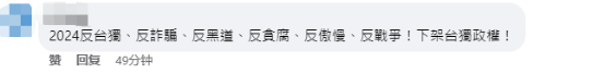 還有網友喊出,“2024反‘台獨’、反詐騙、反黑道、反貪腐、反傲慢、反戰爭!下架‘台獨’政權!”