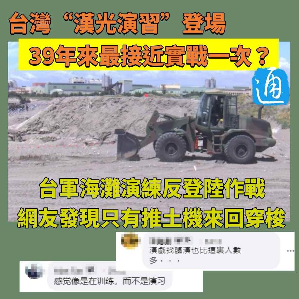 (香港新聞網製圖) 據台灣防務部門公開資訊,此次演習除了強化“戰力保存”,還大幅增加了所謂民間重大基礎關鍵設施的參與,包括在首次徵用的台東豐年機場起降戰機、在桃園機場實施反空降,在淡水河、八里海灘及台北港一帶進行反登陸作戰,這些都是今年的重頭戲。但受超強颱風“杜蘇芮”影響,豐年機場操演已確定取消。 而為了營造實戰氣氛,台軍一周前便已陸續展開多項預演,並在演習前夕拍片喊話,“這次,我們的主場,就由我們來守護”。 台媒亦大肆炒作稱,今年的演習是39年來“最逼真、最接近實戰”的一次。 然而,當台灣網友滿懷期待地點進“漢光演習”的直播間,卻看到這樣的一幕:幾台推土機在沙灘上來來回回穿梭,鏟土、整地、挖戰壕,官兵們則在旁邊慢悠悠地安插詭雷、鐵絲網等,毫無緊張氣氛。