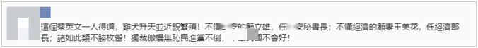 還有網友批評稱,“這個蔡英文一人得道,雞犬升天并近親繁殖!不懂‘國安’的顧立雄,任‘國安’秘書長;不懂經濟的王美花,任經濟部長;諸如此類不勝枚舉!獨裁傲慢無恥民進黨不倒,台灣不會好!”