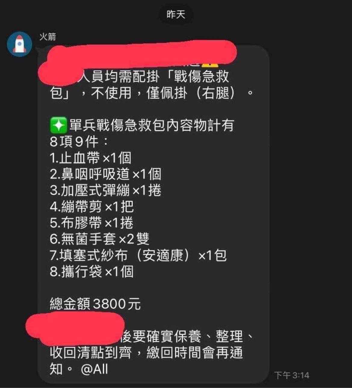 (中新網圖片) 據台灣網友在社媒平台分享的彈藥庫爆炸現場急救照片顯示,爆炸後第一時間,在急救車還沒趕到之前,已有官兵為重傷者上臂打上止血帶,為後面的治療爭取寶貴時間。 但問題來了。該網友指出,受傷官兵所用的止血帶,並非台軍方配發的“CAT GEN7止血帶”,而是現場人員自購的! 據報道,2022年開始,台軍方就不斷宣傳要斥資5.6億(新台幣)採購比照美軍規格的新式急救包,其中止血帶還是美國專利。 台軍高層表示,戰場上以止血為重,根據美軍使用經驗,新式急救包更能有效提升戰傷官兵存活率。 所以,為什麼會出現救官兵止血帶是自購的情況? 對此,台灣“基進黨”台北黨部主委、外科醫師吳欣岱在臉書透露,這是因為台軍採購的新式急救包,屢屢傳出只拿來配合“高裝檢”,甚至有基層官兵反映,收到上級長官發出“只能佩掛、不能用”的指令。