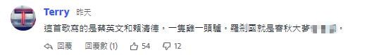“這首歌寫的是蔡英文和賴清德。一隻雞一頭驢。羅剎國就是春秋大夢‘台獨國’。”