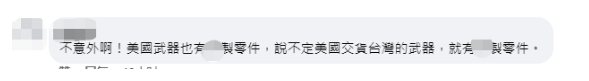 “不意外啊!”還有網友稱,美國武器也有大陸制零件,說不定美國交貨台灣的武器,就有大陸制零件。↓