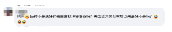 有網友諷刺,“呵呵,lie神不是說好的去白宮找拜登喝茶嗎?美國台灣關係有史以來最好不是嗎?”↓