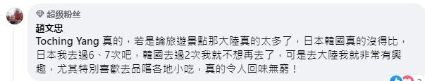 有網友表示,“若是論旅游景點,那大陸真的太多了,日本韓國真的沒得比,日本我去過6、7次吧,韓國去過2次我就不想再去了,可是去大陸我就非常有興趣,尤其特別喜歡去品嚐各地小吃,真的令人回味無窮!”
