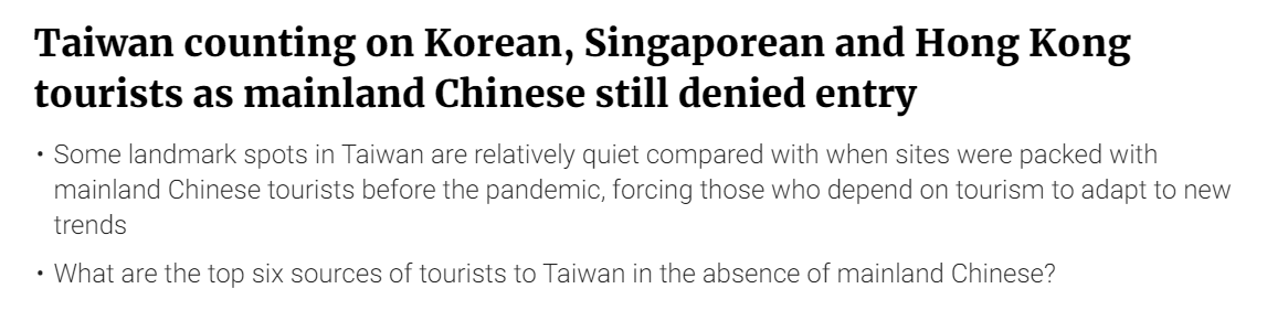 報道標題截圖 《南華早報》一篇原為關注台灣旅遊業由於陸客的缺席而顯得冷清的報道中提到,一名由於申請中國大陸簽證時間太久,轉而選擇台灣地區旅遊的新加坡遊客表示,因為沒有太多的大陸旅客,太魯閣顯得很空曠,遊玩很有趣。結果,被綠媒斷章取義成“沒陸客更好玩”。