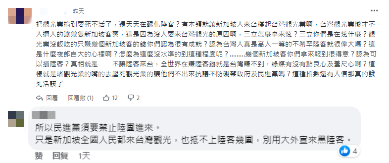 還有網友批評綠媒“把觀光業搞到要死不活了,還天天在醜化陸客?”“所以民進黨需要禁止陸團進來。只是新加坡全國人民都來台灣觀光,也抵不上陸客幾團,別用‘大外宣’來黑陸客。”