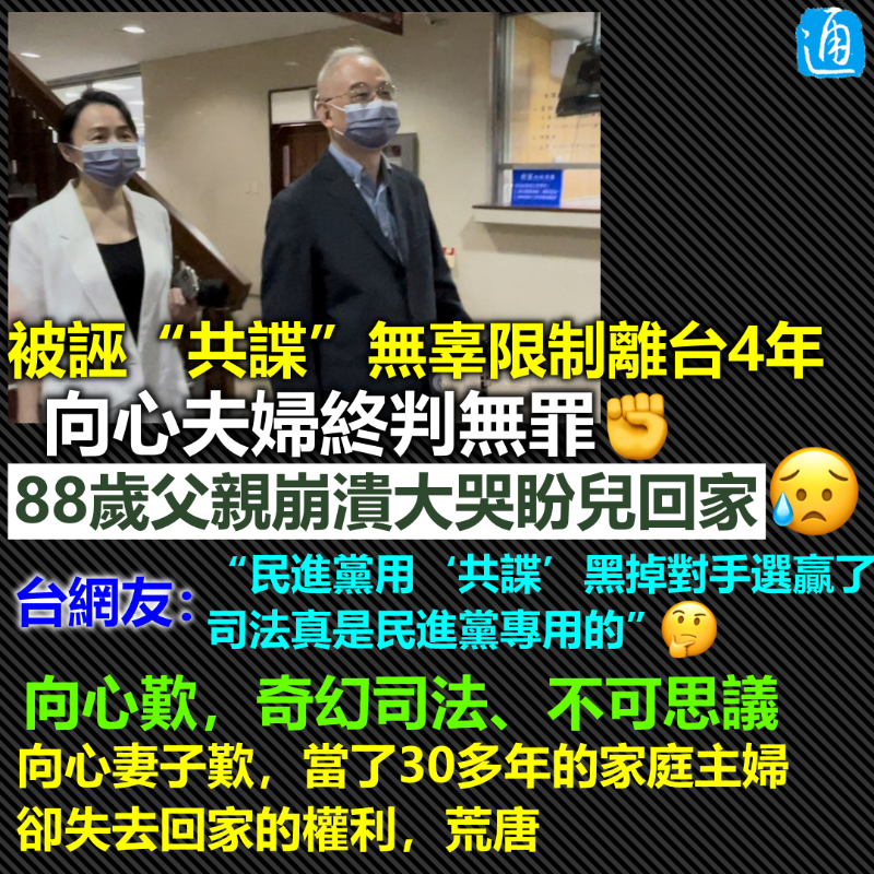 港商向心夫婦被誣“共諜”,滯留台灣4年終確定無罪香港新聞網8月18日電 港商向心夫婦被限制離台4年、被檢調偵辦長達1363天後,終於在昨日(17日)洗刷2人遭誣陷“共諜”之名。