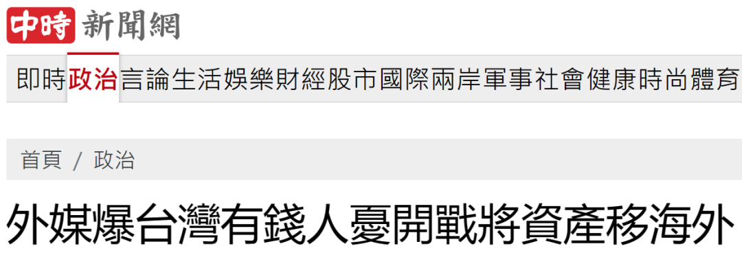 柯文哲 圖源:台灣“中央社” 中央廣播電視總台“看台海”指出,台媒的報道一定程度上佐證了柯文哲的話并非空穴來風。 台灣“中時新聞網”援引外媒報道稱,台灣有錢人以及中產階級擔心兩岸開戰,正設法將資產移到海外。