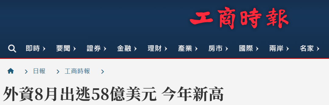 台灣《工商時報》日前報道, 2023年8月外資淨匯出金額增至約58.09億美元,創今年單月新高,也是去年3月以來近17月的高點。