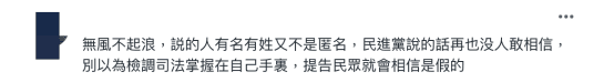 還有網民留言,“無風不起浪,說的人有名有姓又不是匿名,民進黨說的話再也沒人敢相信,別以為檢調司法掌握在自己手裡,提告民眾就會相信是假的”。