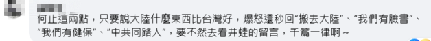 還有網友補充,“何止這兩點,只要說大陸什麽東西比台灣好,暴怒還秒回‘搬去大陸’、‘我們有健保’,這些留言千篇一律啊……”