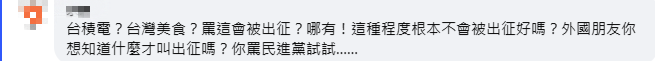 不過,慢慢地評論區就“歪了樓”,有網友表示很“驚訝”,說台積電和台灣美食不好會被“出征”?這種程度根本不叫“出征”好嘛,外國朋友如果想知道什麽才叫“出征”,妳罵民進黨試試?