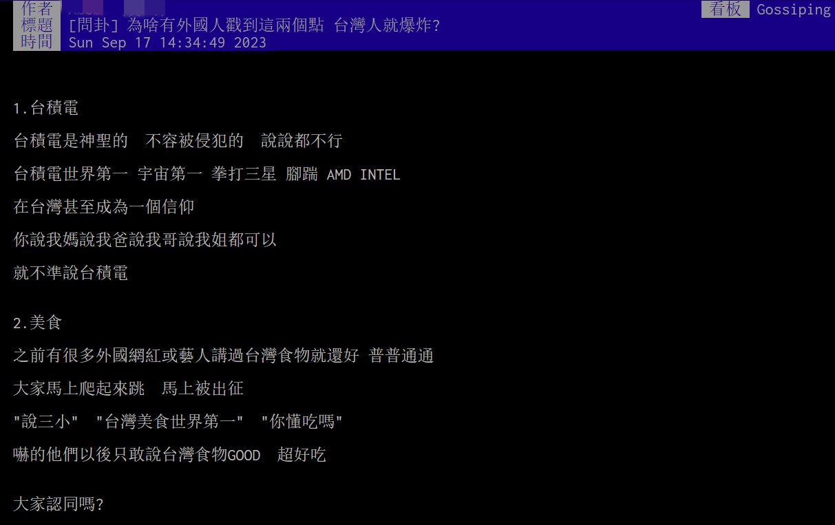 台灣PTT論壇截圖 據台媒報道,近日有台灣網友在島內論壇PTT上發文分享自己的觀察:“為何一旦有外國人觸碰到這兩點,台灣人就爆炸?” 該網友表示,首先就是台積電,台積電是台灣人的驕傲,被譽為“護台神山”,在全球半導體產業中占有領先地位,所以“台積電是神聖的、不容被侵犯的”,“台積電世界第一、宇宙第一、拳打三星、腳踹AMD”,在台灣台積電甚至成為一種信仰,什麽都可以說,“就是不準說台積電(不好)”; 另一個容易惹火台灣人的話題就是台灣美食,之前有很多外國網紅或者藝人說台灣的食物普普通通,卻被大批台灣網民“出征”,“台灣美食世界第一”、“妳懂吃嗎?”嚇得他們以後只敢說台灣美食“超好吃”,對此貼主還詢問“大家認同嗎?” 多家台媒報道之後,相關話題也吸引了眾多台灣網友的關註,有網友表示贊同: “台南人只要聽到食物不好吃就會暴怒!”