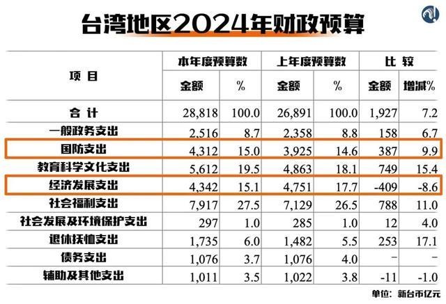 9月初,台灣地區副領導人賴清德,首次以民進黨參選人身份正式召開記者會,闡明了所謂“實現和平發展”的路徑: 備戰才有辦法避戰,避戰才有辦法和平發展。 這也是民進黨當局正在遵循的發展路徑:把軍備與發展捆綁,優先軍備,再說發展。 民進黨當局不久前通過的2024年財政預算案就很能說明問題。各項支出中,防務支出繼續保持增長,經濟發展支出卻是所有領域中跌幅最大的。