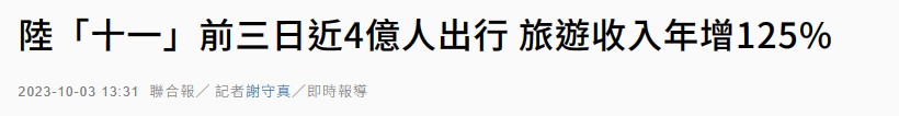 還有島內媒體注意到,受益於亞運會所帶來的經濟效益和社會效益,杭州在“十一”期間整體訂單預訂量同比增長542%,酒店預訂量同比增長超8倍。 大陸“雙節”火熱的旅遊消費市場令島內業者艷羨不已,不少網友在相關報道評論區留言直呼“看得到吃不到!”