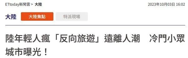 台灣“東森新聞雲”則觀察到,中秋、國慶假期,為了避開人潮,越來越多大陸年輕人選擇“反向旅遊”,旅遊目的不再只是打卡網紅景點,而是以放松隨興為主。一些風景好但人少的小眾城市逐漸受到矚目。