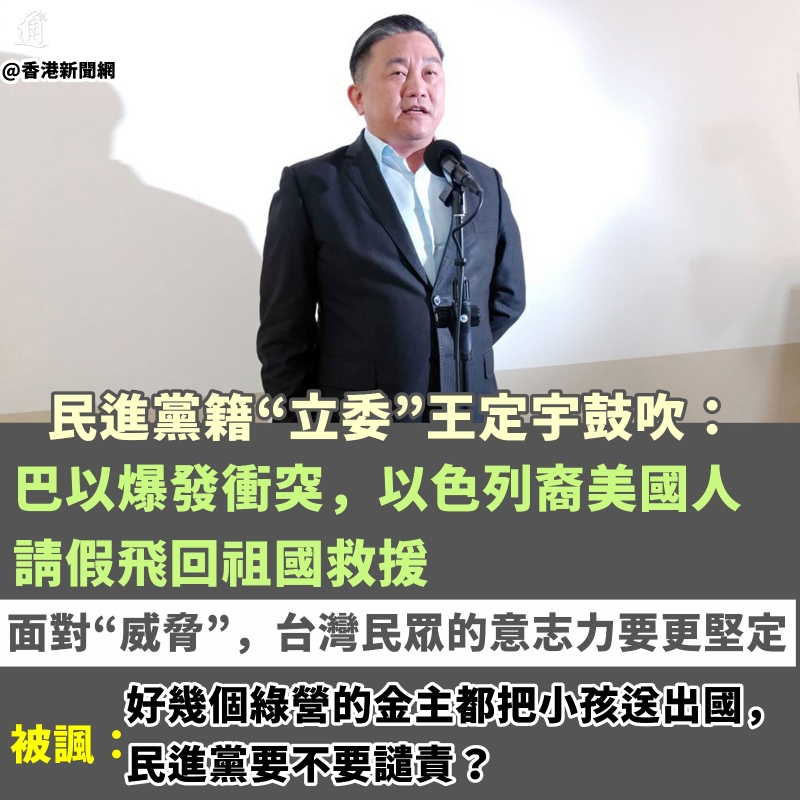 香港新聞網10月10日電 巴勒斯坦與以色列近日爆發新一輪大規模衝突,引發全世界關注。一向“不甘寂寞”的綠營政客竟也“借題發揮”,鼓動台灣人面對所謂“威脅”,立場要“堅定”,沒想到遭到狠狠嘲諷! 就巴以局勢,民進黨籍“立委”王定宇在臉書發文說,一堆在矽谷享有高薪的以色列裔美國人請假飛回祖國, “帶著熱愛家鄉的心和捍衛自己國家的熱情,自己的國家自己救,這樣的國家不會亡”。接著他鼓吹道,“相較於以色列、烏克蘭,面對‘威脅’和‘侵略’,台灣民眾的意志力要更堅定!” 一番美化戰爭的“高談闊論”立即引來無數台灣民眾嘲諷,大家紛紛表示,若是台海爆發衝突,民進黨政客第一個跑:“民進黨肯定跑,蔡英文的逃跑演練是鬧著玩的嗎?”“嘴上說說而已,只會讓民眾當肉盾!” 台資深媒體人毛嘉慶直斥,民進黨人不要借著巴以衝突歌頌戰爭了,戰爭會造成大量傷亡、生靈塗炭,“台灣連蛋都不夠吃,怎麼能經受得住打仗?”