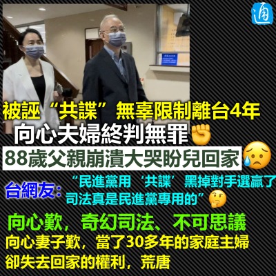 龔青(左),向心(右) 圖源:台灣“中央社” “台灣高等法院”稱,向心夫婦確定獲判無罪,將撤銷兩人限制出境、出海的強制處分。向心夫婦10月12日通過律師發表聲明稱,“千言萬語,我們用6個感謝形容這次奇幻之旅:感謝律師團隊的不懈努力,感謝二級法院的公正判決,感謝媒體朋友的公正報道,感謝在台友人的不離不棄,感謝台灣醫生的悉心照顧,感謝陌生路人的加油鼓勵!”并在最後終於說出“台灣再見”。據報道,台北地方法院審理時曾扣押向心夫婦名下7.5億元新台幣財產,包括台北市信義路5段的3戶豪宅,也將解凍歸還。 向心在審理時曾表示自己滯留台灣4年,是“奇幻的司法之旅”。該事件起源於自稱“共諜”的大陸籍男子王立強2019年11月24日向澳大利亞媒體爆料稱,他受向心夫婦指示在台從事情報工作,介入2020年台灣地區領導人選舉,幫當時國民黨候選人韓國瑜助選。蔡英文隨即言之鑿鑿地聲稱,“‘國安單位’對此都有掌握”。當天,台“調查局”就在機場攔截準備出境的向心夫婦,台北地檢署依涉嫌違反所謂“國安法”將二人列為被告,并限制出境。在偵辦1363天后,向心夫婦終獲不起訴處理結果。 但台灣檢方并未罷休,隨即將重點轉向洗錢案,指控向心夫婦配合涉嫌吸金詐騙的大陸公司,將不法所得“假投資,真洗錢”,購買台北市信義區3戶豪宅,并向法院申請沒收。一審向心夫婦被判無罪,台檢方上訴後,二審“台灣高等法院”認為無證據證明二人參與非法吸金及洗錢,9月6日駁回檢方上訴,仍判無罪。據台媒報道,向心在審理過程中痛批台灣檢方的邏輯很混亂,“既然指稱我與龔青是‘共諜’,豈有‘共諜’將‘共區’資金洗至‘敵區’之理?”龔青也表示自己當了30多年的家庭主婦,卻失去回家的權利,世界上竟有這麼荒唐的事。 前國民黨台北市議員羅智強稱,向心夫婦只因王立強的一個謊言,就被困台灣近4年,有家歸不得。民進黨對他們的人權視而不見,當初大聲叫囂造謠、利用此案“抹紅”韓國瑜的親綠人士與媒體也裝作此事不曾發生,“十足的政治辦案,十足的侵害人權,十足的認知作戰”。他認為民進黨欠向心夫婦和韓國瑜一個道歉,因為這起假“共諜案”不僅戕害人權,更是“抹紅”認知戰的經典惡例。台資深媒體人李晴果撰文稱,向心夫婦涉及所謂“共諜案”即使已無罪定讞,仍無法出境,年逾六旬的向心三番兩次要求“讓我們回家吧”都未獲同意。如此不幸的境遇,是所謂台灣民主的笑話。 台灣《聯合報》此前發表社論稱,此案是“台灣司法之恥”。王立強的說法很快就被發現疑點甚多,時機點的巧合也令人懷疑背後目的不單純。儘管如此,蔡英文當局仍趁機大肆操弄,動員安全、檢調跨境調查。“五眼聯盟”情報單位涉入,欲將王立強事件打成國際事件的企圖不言而喻。今年年初,喧騰一時的“王立強共諜案”在澳大利亞有了最終結果。該國法院認定王立強曾在大陸犯下重罪,并對在澳經商的華人犯下嚴重欺詐罪行,澳官方也未採信其“共諜”身份,拒絕提供政治庇護,決定將其遣返回大陸。至此可以確定,4年前所謂的“共諜案”只是鬧劇一場。王立強是在大陸犯下刑事罪行後潛逃至澳,為了脫罪而編造理由申請政治庇護。然而,台灣司法自甘扮演綠營的幫凶,說穿了與其說是王立強說謊,不如說是民進黨當局利用王立強之謊來欺騙台灣民眾,“把一樁烏龍事件操作成國際大案,向心夫婦因此莫名成為政治操弄下的犧牲品”。 台灣《中時電子報》的社論稱,這個冤案爆發於2020年台灣地區領導人選舉之前,由當時奮力操弄“抗中保台”的民進黨自導自演,意圖對選舉產生影響,向心夫婦無端受害,活活被民進黨當局政治迫害4年,“這樣蠻橫的政權,已到了為了選舉為所欲為的地步,民眾還要繼續忍受嗎?”台灣聯合新聞網12日稱,大陸在案發後很快起底王立強其實是涉案在逃的詐騙犯,并公開其所涉詐騙案的相關庭訊與判決。但這些都不影響台灣辦案背後的政治扭曲與司法操作,“既是政治的諷刺,也是司法的悲哀”。文章認為,蔡英文還欠向心夫婦、韓國瑜和所有台灣民眾一個交代。 【編輯:張依珊】