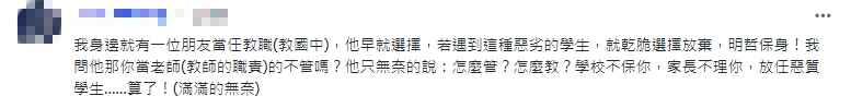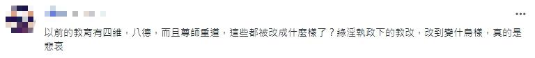 也有網友認為這些問題是教改導致的,“以前的教育有四維、八德,而且尊師重道,這些都被改成什麽樣了,綠營執政下的教改,真的是悲哀”。(完)