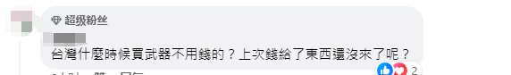 “台灣什麼時候買武器不用錢的?上次錢給了,東西還沒來了呢?” ↓